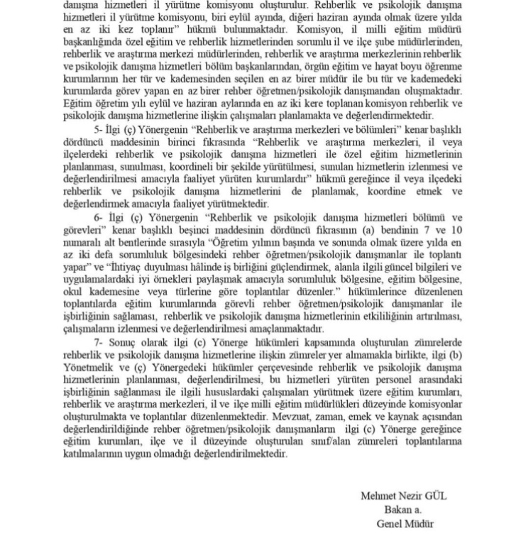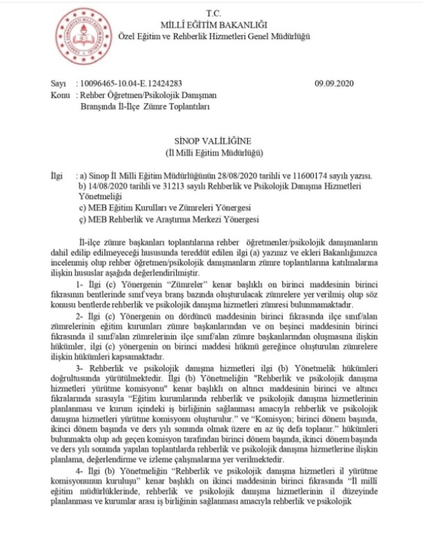 2020 yılında Sinop İl Milli Eğitim Müdürlüğü, Milli Eğitim Bakanlığı’na başvurarak bu konuda görüş talep etmiştir. Milli Eğitim Bakanlığı Özel Eğitim ve Rehberlik Hizmetleri Genel Müdürlüğü, ilgili soruyu ve ilgili yönerge/yönetmelikleri değerlendirerek, rehber öğretmenlerin/psikolojik danışmanların okul, il ve ilçe zümre toplantılarına katılmalarının uygun olmadığı sonucuna varmıştır. Genel müdürlük bu görüşünü 09.09.2020 tarihli ve 12424283 sayılı yazısıyla ifade etmiştir.